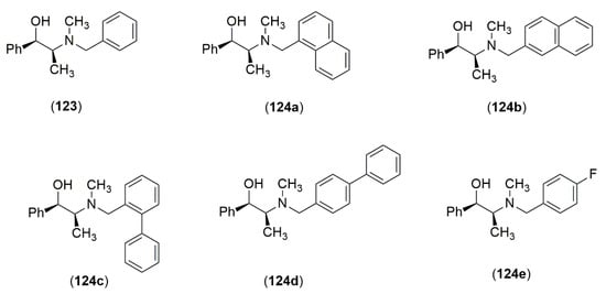 The presence of an N-pyridylmethyl moiety in the Ephedra scaffold leads to diminished levels of enantioselectivity in the asymmetric addition of diethylzinc to aldehydes, which was explained by an additional mode of coordination, where the nitrogen of the N-pyridylmethyl group allows for alternate transition states that compromise the capacity of the ligand from the Ephedra component to transmit asymmetry. The effect is even more pronounced in the case of the asymmetric reaction with diethylzinc and diphenylphosphinoylimines []. In a subsequent study a series of aryl moieties in the place of the phenyl ring of N-benzyl-ephedrine system was synthesized (123, 124a–e). The aryl systems employed varied in structure and electronic properties to obtain a wide chemical variety by the introduction of naphthyl groups and biphenyl groups appended to the nitrogen in place of the phenyl for the increased steric projection of the aromatic motif (Figure 7). When these compounds were assayed in the catalytic asymmetric addition of diethylzinc to aldehydes and diphenylphosphinoylimines, the derivatives yielded a product with enantioselectivities that were comparable to those of N-benzyl-ephedrine. The enantiomeric excesses for the enantioselective addition reactions ranged from 56% to 86% ee. In the case of the catalytic asymmetric addition of diethylzinc to 2-naphthaldehyde, it yielded the N-benzyl-ephedrine alcohol (123) in 82% ee. The same process gave 80% to 86% ee for 124a–e, and showed that the introduction of the different aromatic motifs did not enhance or compromise the overall transmission of chirality [].