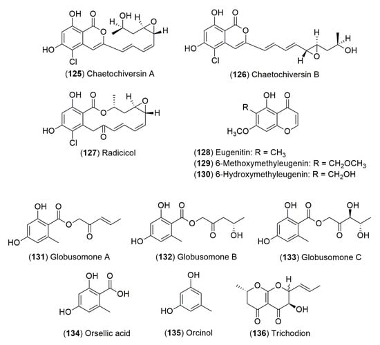 From the endophytic fungus C. chiversii, isolated from E. fasciculata A.Nelson two new isocoumarins, chaetochiversins A (125) and B (126), the β-resorcylic acid lactone mocrolide, radicicol (127) and eugenitin (128), 6-methoxymethyleugenin (129) and 6-hydroxymethyleugenin (130) were isolated. Radicicol (127) showed cytotoxic activity []. Further, C. globosum, also isolated from E. fasciculata A.Nelson, produced three new orsellinic acid esters, globusomones A (131), B (132) and C (133) and three known compounds the orsellic acid (134), orcinol (135) and trichodion (136) (Figure 8) []. Due to the scarce literature published about endophytic fungi from Ephedra species and their chemical profiles, this area of research is promising for discovering new fungal species and new chemical compounds with or without biological activities. These microorganisms can be a valuable source to find new compounds against multiresistant or panresistant microorganisms or with cytotoxic activity. Furthermore, the research focused in this topic will help understand the ecological interaction among Ephedra species and their fungal endophytes.