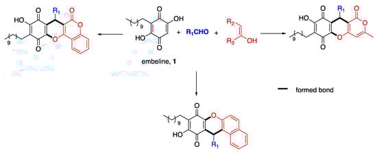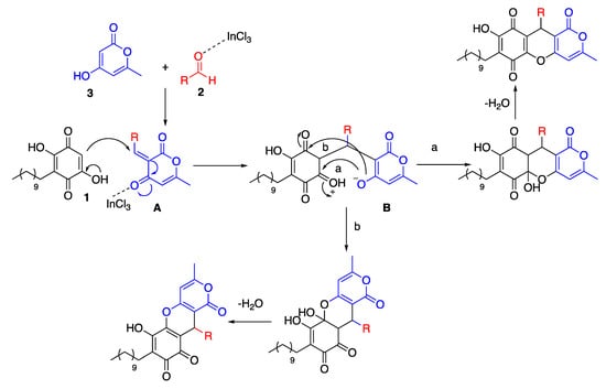 The reaction can be rationalized via the formation of a conjugated electron-deficient enone (A) through a Knoevenagel condensation of 2 and an aldehyde. The next step of this mechanism could involve a Michael addition of embelin (1) to the reactive quinone methide intermediate to yield the intermediate (B), which can undergo an intramolecular cyclization through carbonyl a to give the para-quinone adduct or through carbonyl b to yield the ortho-quinone adduct (Scheme 3).