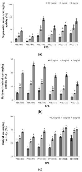 3.5. Determination of Antioxidant Activities of Ropy EPS