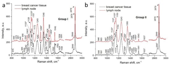 Consequently, when the Raman spectra of the breast cancer tissues and LNs collected from women with recurrence of the cancer disease were compared (Figure 2b), we observed complete similarity of the obtained signatures. The Raman bands of the LN spectrums corresponding to proteins and carbohydrates are slightly more intensive than those of the breast tissues’ spectrum. At the same time, overall intensity of the Raman spectra collected from the samples of the II group of the patients is almost three times higher than that of the I group. In addition, the vibrations of carbohydrates and amide III are much more intensive in the case of the II group’s samples. The Raman spectra of both the breast cancer tissues and LNs do not contain even weak bands (e.g., 1520 cm−1) showing some affinity to the normal tissues as it was observed in the Raman spectrum of the breast cancer tissues taken from the patient without recurrence.