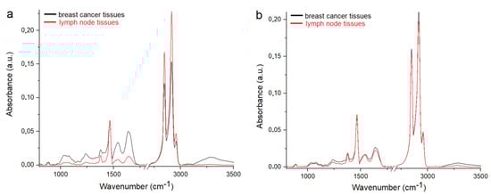 Average FTIR spectra of the breast cancer tissues and LNs from the (a) I and (b) II groups.