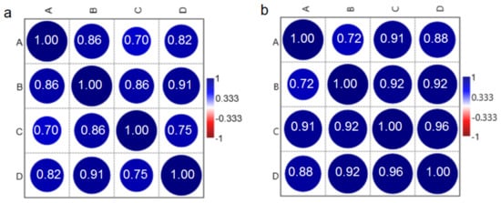 Pearson’s correlation test (N = 48) for the (A, C) breast cancer tissues and (B, D) LNs collected from women (A, B) without and (C, D) with the disease recurrence. Data were collected from the (a) Raman and (b) FTIR spectroscopies.