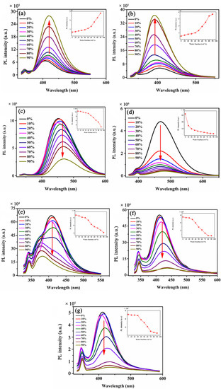Fluorescence spectra of compounds in CH3OH/H2O mixed solutions (c = 2.07 × 10−5 M) with different water fractions (0–90%) (a) 1, (b) 2, (c) 3, (d) 4, (e) 5, (f) 6, (g) 7.