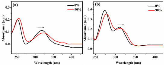 As can be seen in Figure 2, the pure CH3OH solutions of compounds 1 and 2 showed absorption peaks at 317 and 311 nm, respectively. In Figure 2a, when the water fractions changed from 0 to 90%, there was significant red shift. Figure 2b also showed the same phenomenon. The above results suggested that the solutions of compounds 1 and 2 with 90% water fraction may form a new aggregate capable to promote fluorescence enhancement [27], thereby increasing the PL intensity of the mixed solutions, which is consistent with the results of the above fluorescence spectra. As the water fractions increases, the new aggregates in the solution become more and more, so the PL intensity becomes stronger and stronger, which is consistent with the characteristic of AIEE compounds.