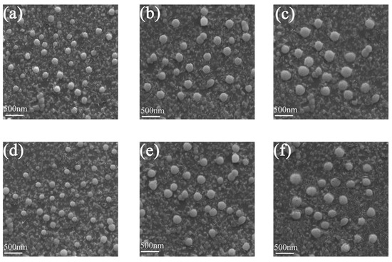 For further confirming the reason for AIEE characteristics of compounds 1 and 2, the particles of the compounds with different water fractions were observed by SEM. Figure 3a–c are the images of SEM of compound 1 in the CH3OH/H2O (5:5, 2:8, 1:9 v:v) mixed solutions. The particles appeared as uniformly dispersed spherical particles, and the spherical particles were small when the water fraction was 50%. The diameter of spherical particles in the solution gradually increased as the water fractions increased. When the water fraction was 90%, the spherical particles were the biggest. Figure 3d–f shows the SEM images of compound 2 in the CH3OH/H2O (5:5, 2:8, 1:9 v:v) mixed solutions. The change of particles were in accordance with that of compound 1. The SEM images indicated that the diameter of the particles increased when the water fraction changed from 50 to 90%. By comparing with the PL spectra, it can be inferred that the increase of the diameter of the particles are advantageous for enhancing the PL intensity.