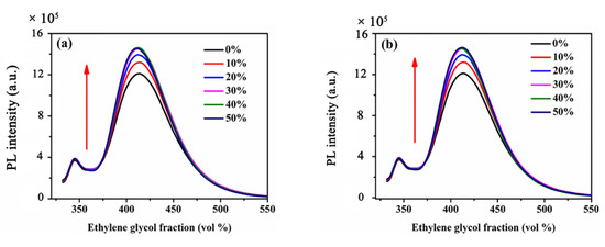 Fluorescence spectra of compounds in the mixed solutions of CH3OH/EG (v:v) (a) 1, (b) 2.