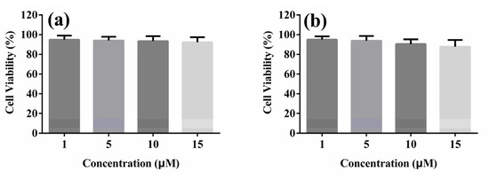 To investigate these AIEE compounds whether can be further applicated in biology, cytotoxicity of compounds 1 and 2 in A549 cells was tested by using MTT assay. A549 cells were incubated with different concentrations (1, 5, 10 and 15 μM) of compounds 1 and 2 for 24 h. The results are shown in Figure 5, which concluded that compounds 1 and 2 showed low cytotoxicity to A549 cells within 24 h. Cell viability exceeded 80% at each concentrations, indicating that compounds 1 and 2 have good cytocompatibility in the experimental concentration range.