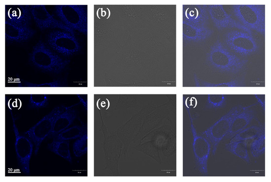 (a) The fluorescence image of compound 1 in A549 cells. (b) The bright-field image. (c) The merge image of (a) and (b). (d) The fluorescence image of compound 2 in A549 cells. (e) The bright-field image. (f) The merge image of (e) and (f). The excitation wavelength was 359 nm. The collected wavelength range was 430–480 nm.