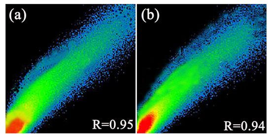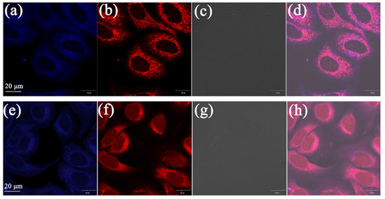 In order to investigate whether they accumulate in mitochondria like flavonoid AIEE compounds, mitochondrial co-localization experiments were performed. Mito Tracker Red (200 nM) and compounds (10 μM) were stained together and then observed. Both compounds 1 and 2 showed bright blue fluorescence in Figure 7a,e, and the mitochondria in the cytoplasm showed red fluorescence in Figure 7b,f. Moreover, the stained site of compounds 1 and 2 and that of Mito Tracker Red are highly coincident in Figure 7d,h. In order to accurately analyze the coincidence, the corresponding R values (Pearson correlation coefficient, the coefficient indicating the degree of coincidence, range +1 to −1) were measured, and the results are shown in Figure 8. The coefficients were 0.95 and 0.94, respectively, indicating compounds 1 and 2 can specifically aggregate in mitochondria and label mitochondria, suggesting that they can be applied in mitochondrial imaging.