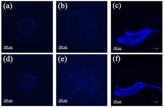 Zebrafish is a simple but important biological laboratory animal, which is widely used in pharmaceutical research. Zebrafish is in vitro fertilized and has up to 87% genetic similarity with human. Importantly, the embryo of zebrafish is almost transparent and the internal tissues and organs are observed [28,29,30,31]. The above results indicated that these flavanones derivatives have a good application prospect in living cell imaging, so for further studies the application of such compounds in bioimaging, zebrafish was selected as the research object. In Figure 9, after administration of 6 hpf (hours post fertilization) zebrafish embryos, the yolk of the embryo showed bright blue fluorescence, indicating that the compounds passed through the embryo membrane into the embryo by simple infiltration. After 48 h, the blue fluorescence also mainly concentrated in the yolk sac. After 5 days, the blue fluorescence also mainly concentrated in the yolk sac and intestinal tract, indicating that the compounds have different affinities for different tissues and organs of zebrafish, and mainly concentrated in the digestive system.