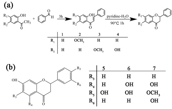 (a) The reaction route of flavanone derivatives 1–4. (b) Chemical structure of compounds 5–7.