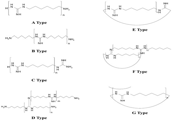 Structures of polyhexamethylene guanidine (PHMG) isomers. Depending on the polymer (oligomer) end groups and the connectivity between the two end groups, PHMG can take on different isomeric forms [11,12].
