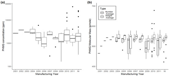 The numbers (Mn) and weights (Mw) of average molecular masses of PHMG by brand and year manufactured.