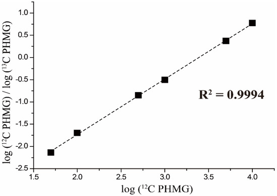 A calibration curve was constructed for PHMG in the range of 50–10,000 ppm using six concentration points. The linearity of the calibration plot was satisfactory with a squared correlation coefficient (R2 = 0.9994) (Figure 4). The precision determined by calculating the coefficient of variation (CV, %) of replicates within runs on one day (intra-day) was well below 15% for a wide range of PHMG concentrations. The accuracy (relative error) obtained by calculating the percent deviation from the nominal concentration was mostly within 10% of the nominal values. The recovery efficiency was determined to be 73%; some analytes were lost during the sample purification procedure.