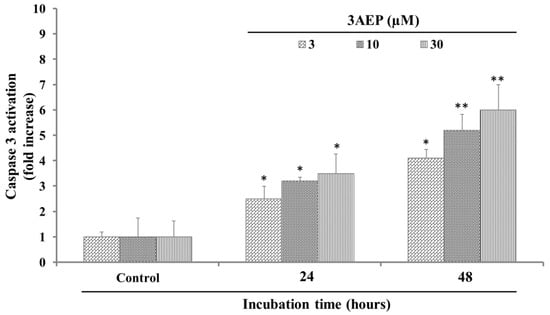 Effect of 3AEP on caspase-3 activation in HL-60 cells. Cells were incubated with 3AEP (0–30 μM) for 24 and 48 h. The cell lysates were incubated at 37 °C with caspase-3 substrate (Ac-DEVD-AFC) for 1 h. The fluorescence intensity of the cell lysates was measured to determine the caspase-3 activity. The blank group was used as 0.1% DMSO-treated cells. Data are presented as the mean ± SD of results from three independent experiments (* p < 0.01; ** p < 0.05).