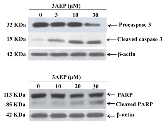 To identify whether 3AEP could induce HL-60 cell death by an apoptotic pathway, we measured the protein levels of caspase 3 and cleaved poly(ADP-ribose) polymerase (PARP) using western blotting analysis. PARP is a protein family that plays an important role in many cellular processes, such as DNA repair, genomic stability, and programmed cell death. Catalyzing caspase-3 generally leads to the cleavage of PARP, and this process which plays a positive regulatory role in the apoptosis of several cells, is considered as a biomarker for the detection of apoptosis []. The HL-60 cells were treated with 3AEP (0–30 µM) for 48 h. Protein (50 µg/lane) from cells lysates was electrophoresed on SDS-PAGE gels, and then transferred to total blot PVDF membranes. As shown in Figure 3, 3AEP induced the caspase 3 transform into its cleaved form in a dose-dependent manner. Exposure of 3AEP for 48 h also triggered PARP into cleavage form (Figure 3).