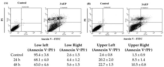 In the next study, flow cytometry analysis was performed using an Annexin V/PI double staining assay for 24 h (A) and 48 h (B) in the presence of 3AEP (10 μM). HL-60 cells were harvested and stained with PI and Annexin V-FITC in darkness for 15 min, and subjected to flow cytometry using a BD Biosciences platform. Early and late apoptotic and necrotic cells were identified clearly (Figure 4). Treatment of HL-60 cells with 3AEP (10 μM) has increased the population of Annexin-V+/PI+ (late apoptosis) and Annexin-V+/PI− (early apoptosis) cells in a time-dependent manner. Interestingly, the population of Annexin-V−/PI+ (necrosis) has been shown with about 20.2 to 22.7%. Together with the western blotting results that both the cleavage of capase 3 and PARP, the two important apoptotic marker proteins, it is worthy to note that 3AEP could induce apoptosis in HL-60 cells via caspase pathways.