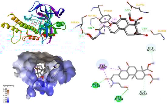 When the 3AEP was docked into the catalytic active site of PARP-1, the results indicated a high affinity, with a binding energy of −9.63 kcal/mol. The detailed interaction diagram (Figure 5) showed that 3AEP has several interactions with PARP-1. The hydroxyl, methoxy, and carbonyl groups of the 3AEP were found to form hydrogen bonds with Gly863 (1.8 Å), Ser904 (2.11 Å), Glu763 (3.37 Å), and Gly888 (3.03 Å) at both monomers. In the nicotinamide-binding pocket of PARP-1, Tyr907 interacted with nicotinamide ring to maintain NAD+ in this pocket []. Therefore, the binding of the compound with the active site of PARP-1 occured with high affinity and many interactions. One of these interactions is the critical residue Tyr907 at hydrophobic, which might interfere with the binding of NAD+ and affect the activity of PARP-1 []. These docking results suggested that PARP-1 target is more appropriate than caspase-3. The results demonstrated that 3AEP can bind to both the procaspase-3 allosteric site and the PARP-1 active site (Figure 6). However, further studies such as detail PARP-1 inhibition and PAPR-1 binding assays should be performed to validate this finding.