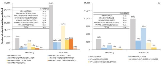 In order to numerically quantify its evolution, the increase in the number of published scientific articles (in %) was calculated, taking into account the difference in the number of items between the last two decades. The results in each of the considered areas are included in Figure 1a,b. As shown in Figure 1a, between 2000 and 2009, HPH were used mainly for the extraction of proteins, although a large number of research works focused on microorganisms and enzymes inactivation, contributing to food preservation and safety. The last decade (from 2010 until now) revealed a significant increase (74.87%) in the total number of scientific articles published. The main areas in which there was an increase greater than the total value were the use of HPH for microorganism inactivation, fiber extraction, and above all, bioactive and probiotic components. The application of HPH to extract or increase the functionality of bioactive compounds, and to improve the probiotic effect, grew by 89% and 87.9% respectively (Figure 1a). The increasing interest among consumers and the food industry in improving the organoleptic and nutritional quality of foods, along with concern for the valorization of food waste, might explain this result.
