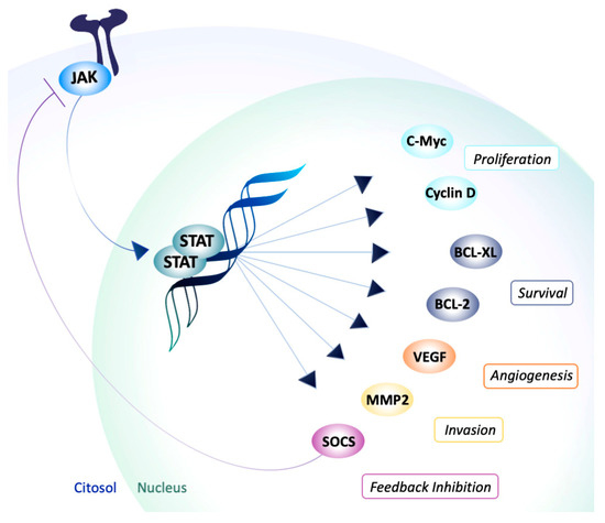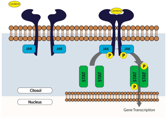 Janus kinases (JAKs) belong to the family of protein tyrosine kinases (PTKs). The JAKs subgroup consists of four members: JAK1, JAK2, JAK3 and Tyrosine Kinase 2 (TYK2). JAKs are stimulated by numerous cytokines (interleukins, interferons and hormones) and modulate the activation of signal transducer and activator of transcription (STAT) proteins by sitting at the top of signaling pathways that regulate several transcription processes (Figure 1) [8,9,10]. Cytokines are a group of polypeptide growth factors with low molecular weight (30 kDa) mainly involved in inflammatory processes, and they function by binding to the extracellular domains of different receptor superfamilies, leading to downstream signaling cascades [11]. They employ a crucial role in several physiological functions, especially in cell growth regulation and in both innate and adaptive immunity, as well as in human diseases [12,13].