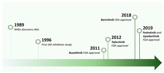In 1996, a compound with JAK2 inhibitory activity was reported to inhibit acute lymphoblastic leukemia (ALL) cell growth [22]: it was the first evidence of the role of JAKs as druggable targets.