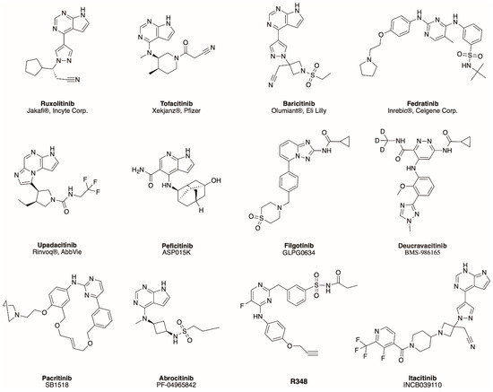 Molecular structures of FDA approved and investigational JAK inhibitors.