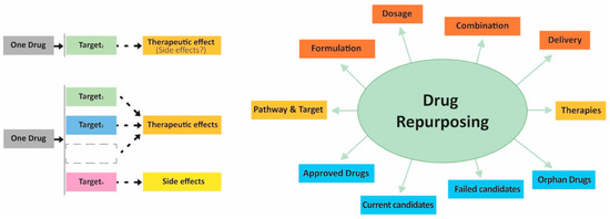 Compared with the use of single-target drug combinations, the multitarget approach shows different advantages, such as higher efficacy, improved safety profile and simpler administration [84]. Drugs with multitarget profile effects can provide advanced therapeutic outcomes and a decrease in the side effect profile. This approach also facilitates the drug repositioning process hence promoting the use of approved and commercialized drugs for new therapeutic purposes (Figure 4) [85].