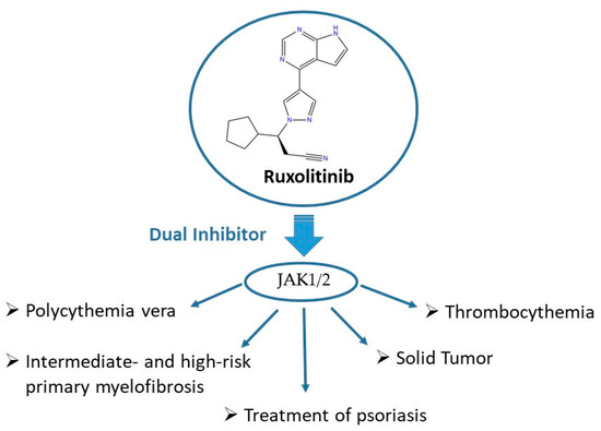 Immunomodulatory properties of ruxolitinib were also proven beneficial in corticosteroid refractory acute GvHD [92,93]. Ruxolitinib is also effective in treating of essential thrombocythemia and psoriasis [94,95], and in a recent study, it was repurposed as an anticancer agent for solid tumors [96] (Figure 5). In a recent clinical trial, ruxolitinib was also considered for drug-repurposing in the treatment of COVID-19 for its anti-inflammatory and immunosuppressive properties [97,98].