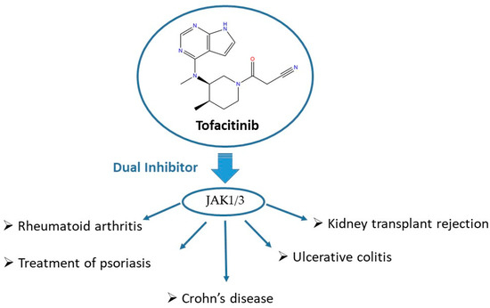 Tofacitinib is a reversible and competitive antagonist that binds to the ATP-binding site in the catalytic cleft of the kinase domain of JAKs. Tofacitinib, specifically, inhibits JAK1, JAK2, JAK3 and to a lesser extent, TYK2, also presenting a high degree of selectivity against other kinases in the human kinome [99]. In the cellular environment, where JAKs signals are coupled, tofacitinib preferably inhibits the signaling by cytokine receptors associated with JAK3 and/or JAK1 with functional selectivity over JAK2 [100]. So far, tofacitinib is the only approved dual JAK1/3 inhibitor, which has demonstrated efficacy for autoimmune diseases and has been tested in the treatment of skin diseases [38,101,102]. Tofacitinib has also shown effectiveness in psoriasis, UC, kidney transplant rejection and Crohn’s disease (Figure 6). Additionally, tofacitinib was repurposed in the therapy against myeloma to reverse the growth-promoting effects of the bone marrow microenvironment [103].