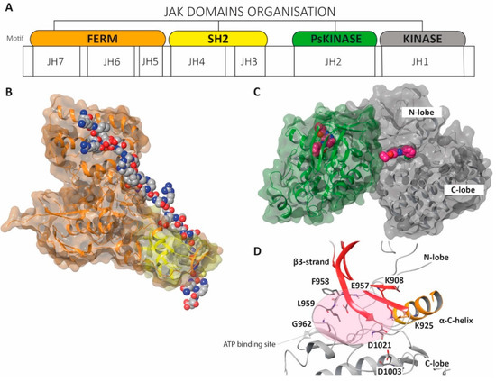 (A) The schematic architecture of the JAKs domains. (B) Crystal structure of the FERM/SH2 JAK1 domains in complex with the intracellular domain of interferon lambda receptor 1 (IFNLR1). The FERM and SH2 domains are colored in orange and yellow, respectively. (C) Crystal structure of the JH2 and JH1 domains with a kinase inhibitor bound in the active site. The compound (purple) is shown as spheres. JH2 and JH1 are colored in dark-green and grey respectively. (D) Frontal view of the JAK1 ATP binding site (pink). The α-C-helix (orange) and the β-sheet (red) with the main relevant amino acid residues (sticks) of the activation segment are depicted. The figure was prepared using Schrödinger, LLC suite.