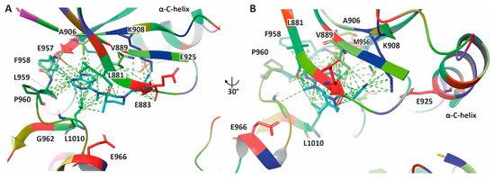 Tofacitinib is a first-generation JAK inhibitor, a competitive antagonist that binds to the ATP-binding site (Figure 9A). Tofacitinib inhibits the phosphorylation and activation of JAK, thereby avoiding the phosphorylation and activation of STATs. Consequently, gene transcription is suppressed and the result of these events is a significant reduction of cytokine production and a modulation of the immune response is observed [112,113]. Its interactions within the ATP binding site play a key role in defining the structure–activity relationship (SAR) profile of the drug. N7 of the pyrrolo [2,3-d]pyrimidine scaffold makes one hydrogen bond with the carbonyl group of E957, and N1 of the pyrimidine ring forms a second hydrogen bond with the amino group of L959 in JAK1 (Figure 9B–E). The cyanoacetyl moiety significantly contributes to the stabilization of the structure as it extends beneath the β-3-sheet and in front of K908 on the α-helical C-terminal lobe. It is worth noticing how the methyl group of the piperidine ring was exposed to the solvent in the front cleft (Figure 8D; Figure 9B,D,E) and many hydrophobic contacts with L881, V889, A906, V938, M956, P960 and L1010 were detected (Figure 10).
