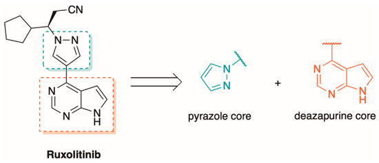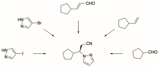 The substituted pyrazole ring is the key compound for the synthesis of ruxolitinib. Despite being the first therapeutic JAK1 and JAK2 inhibitor, only two articles have been published [114,115]. Recently, a patent was registered that provides an alternative procedure to obtain ruxolitinib on an industrial scale [116].