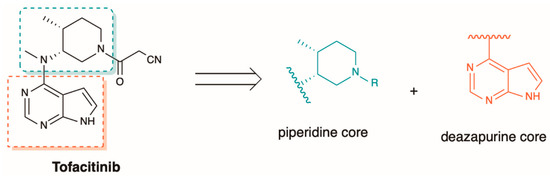 Tofacitinib can be fragmented in two synthons, the (3R,4R)-disubstituted piperidine and the deazapurine core (Figure 13).