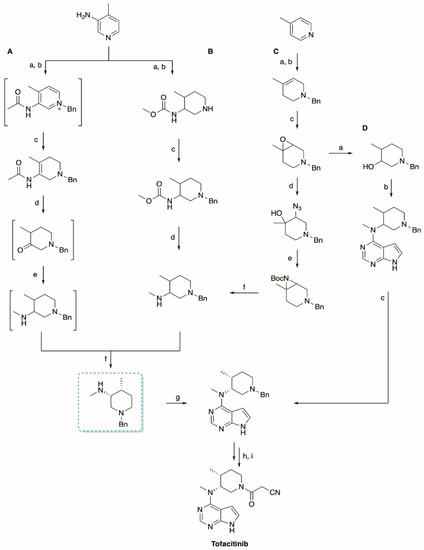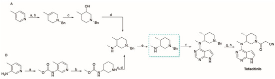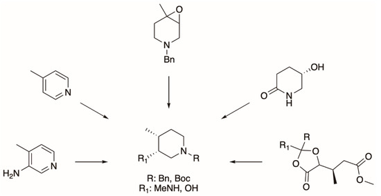 Depending on the chosen synthetic strategy, the synthesis of the (3R,4R)-disubstituted piperidine derivative can be achieved from different commercially available starting materials (Figure 14). The preparation of the piperidine moiety is challenging and requires a final chiral resolution step due to the presence of two asymmetric centers. Therefore, several synthetic protocols have been published to obtain the key (3R,4R)-disubstituted piperidine derivative [117,118,119,120,121].