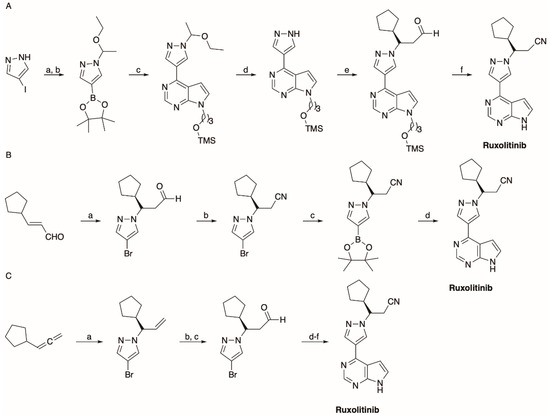 In 2009 Lin et al. [114] synthesized ruxolitinib by an asymmetric organocatalytic Aza-Michael reaction, which encompasses the addition of a substituted pyrazole to an α,β-unsaturated aldehyde. The authors provided two different approaches to obtain the substituted pyrazole moiety, which is finally linked to the deazapurine synthon to afford ruxolitinib (Scheme 1A,B). In Scheme 1A, 4-iodopyrazole is used to provide the appropriate N-substituted pyrazole unit as a Michael donor. Alternatively, 4-bromopyrazole is directly treated with an α,β-unsaturated aldehyde to yield ruxolitinib (Scheme 1B). Following the first strategy, the reaction of 4-iodopyrazole with ethyl vinyl ether provided the protected pyrazole, which was treated with methoxy pinacol borate to yield the pyrazole pinacol borate (Scheme 1A, steps a and b). Then, Suzuki coupling of the latter with TMS-protected-6-chloro-7-deazapurine (Scheme 1A, step c) and further hydrolysis of the N-protecting group furnished the key N-substituted pyrazole (Scheme 1A, step d). An asymmetric aza-Michael reaction was performed between this derivative and E-3-cyclopentyl-acrylaldehyde, using an appropriate organ-catalyst to yield the corresponding aldehyde. (Scheme 1A, step e). Finally, the latter was treated with aqueous ammonia and iodine to give the corresponding nitrile (Scheme 1A, step f). The TMS protecting group was removed using lithium tetrafluoroborate (LiBF4) to afford ruxolitinib.