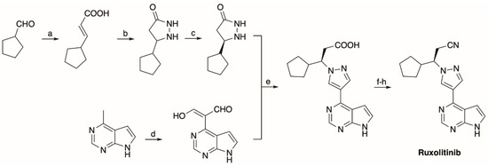 As described in Scheme 1, ruxolitinib essentially was obtained by linking the deazapurine core with the N-substituted pyrazole through a Suzuki reaction. However, the reactions performed to synthesize the pyrazole moiety require high amounts of expensive and complex chiral catalysts [114,115]. Furthermore, the regio- and enantioselectivity of the product obtained by chiral resolution is not high, and the product usually undergoes a multistep refining process to achieve the final compound [114]. Compared to the methodologies proposed by Haydl [115], the amounts of used rhodium catalyst and metal ligand are relatively high and the reaction conditions are quite tough. This method is expensive and is not applicable for industrial production [115]. Therefore, to overcome such hurdles, a patent was recently published providing a new method for the preparation of ruxolitinib, which was suitable for industrial production [116], as outlined in Scheme 2. The cyclopentanecarbaldehyde was selected as starting material to provide the N-substituted pyrazole. In particular, the aldehyde was converted into the correspondent cyclopentyl-pyrazolidinone using malonic acid and hydrazine (Scheme 2, steps a and b). The racemic mixture was resolved with di-p-toluoyl-L-tartaric acid (L-DTTA; Scheme 2, step c). On the other hand, the 6-methyl-7-deazapurine derivative was treated with the Vilsmeier reagent (POCl3/DMF) to provide the corresponding aldehyde product (Scheme 2, step d). This deazapurine derivative reacted with the pure enantiomer cyclopentyl-pyrazolidinone in alkaline condition (NaOH) to yield the N-substituted-deazapurine pyrazole (Scheme 2, step e). The carboxylic group was activated with oxalyl chloride (Scheme 2, step f) and treated with NH3 (Scheme 2, step g) and POCl3/N-Methylpyrrolidone (NMP; Scheme 2, step h) to provide ruxolitinib. Following this approach, the JAKi was obtained in good yield, avoiding the use of complex and expensive catalysts [116].