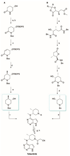 - Maricán, A.; Simirgiotis, M.J.; Santos, L.S. Asymmetric total synthesis of Tofacitinib. Tetrahedron. Lett. 2013, 54, 5096–5098. [Google Scholar] [CrossRef]