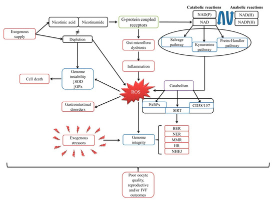 Schematic representation of niacin’s biological cycle. Once ingested, the G-protein-coupled receptors initiate intracellular responses, and niacin is converted into four specific precursors involved in both anabolic and catabolic reactions. However, if the gut microflora is disrupted, it produces a large amount of reactive oxygen species, which influences genome structure. If a depletion occurs, NAD is synthesized through three specific pathways, which strongly correlate with three NAD-consuming enzymes, but also with the production of reactive oxygen species. Subsequently, five highly specialized mechanisms ensure genome integrity against any exogenous or endogenous stressor(s). In the absence of an exogenous supply of niacin, there is a gradual, progressive instability of the genome, characterized by the inability of the antioxidant system to act efficiently, which ultimately leads to cell death. Cumulatively, all of these aspects could ultimately affect the viability of in vitro fertilization protocols through a deterioration of oocyte quality.