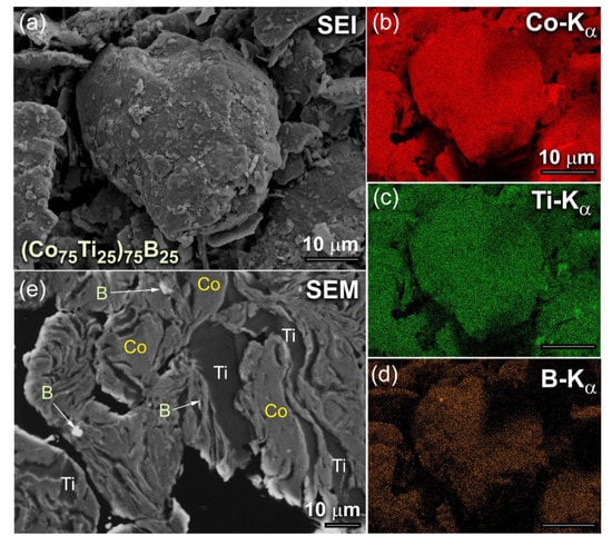 (a) Scanning electron image (SEI) of as-BM (Co75Ti25)75B25 powders obtained after 6 h of MA time. The corresponding EDS-elemental maps of Co, Ti, and B are displayed in (b), (c) and (d), respectively. The FE-SEM micrograph of the cross-sectional view for the powders after this stage of milling is presented in (e).