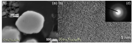 Based on this comparison, we claim that (Co75Ti25)75B25 metallic glassy system revealed the best GFA and possessed high thermal stability. In contrast to these full-metallic glassy systems, nanocomposite (Co75Ti25)70B30 powders, which consisted of a glassy phase coexisted with nano-spheres of unprocessed crystalline B particles (Figure 7) revealed lower ∆Tx (79 °C) and Tx (513 °C) values, as indexed in Figure 8a or Figure 9a,b. The degradation in these thermodynamics parameters may be related to the heterogeneity seen in the chemical composition of (Co75Ti25)70B30, as detected by HRTEM/EDS (Figure 7b, Table 3).
