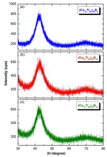 The X-ray diffraction (XRD) patterns of MA-(Co75Ti25)100−xBx (x: 2, 10, and 15 at%) obtained after 50 h of BM time are displayed collectively in Figure 4. All the patterns exhibited only broad diffuse haloes, in scattering range of 2θ between 40–50°, with no indication of any unprocessed crystalline phases. This implying the capability of MA approach to fabricate the desired amorphous alloy powders in a wide amorphous range.