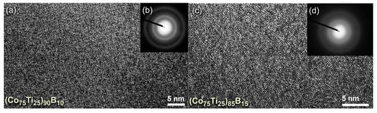 The FE-HRTEM micrographs taken for the end-products of (Co75Ti25)90B10, and (Co75Ti25)85B15 are displayed together with their NBDPs in Figure 5a,b and Figure 5c,d, respectively. The powders had typical fine morphology with random atomic distribution (Figure 5a,c), indicating the formation of short-range order structure. Furthermore, the NBDPs displayed spot-free halo-diffuse pattern, suggesting the absence of long-range order (crystalline phases) and medium-range order (metastable phase), as presented in Figure 5b,d.