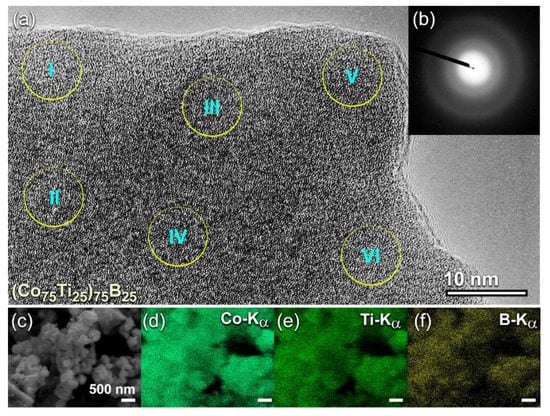 (a) FE-HRTEM, and (b) NBDP of (Co75Ti25)75B25 powders obtained after 50 h of MA time. The corresponding FE-SEM micrograph is shown in (c) together with the elemental EDS-mapping of (d) Co, (e) Ti, and (f) B. The circular symbols indexed with a Roman number (I, II, III, IV, V, and VI) in (a) refer to the zones selected for conducting local (~5nm in diameter) EDS elemental analysis. The analytical results are listed in Table 2.
