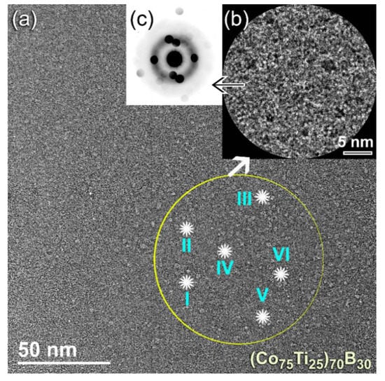 The FE-SEM-EDS elemental maps for the alloying elements of Co (Figure 6d), Ti (Figure 6e), and B (Figure 6f) have indicated that the powers, were homogeneous in the composition without any pieces of evidence of chemical segregations. To realize the glass-forming range of the present ternary system, a further MA experiment with higher B content was carried out. The FE-HRTEM micrograph of (Co75Ti25)70B30 powders obtained after 50 h of MA time is presented in Figure 7a. The morphological characteristics of the powders obtained after this stage of milling show a clear contrast in structure when compared with the previous HRTEM images for those samples contained a low concentration of B (≤25 at%). The higher magnification FE-HRTEM image taken for the circular zone indexed in Figure 7a indicated the existence of grey-nano-lenses (~2 to 3 nm in diameter), embedded in the fine amorphous matrix (Figure 7b). The NBDP (Figure 7c) related to the image presented in Figure 7b revealed a halo-diffuse pattern corresponding to the amorphous matrix, overlapped with sharp spots related to unprocessed nanocrystalline B, as shown in Figure 7c. The results indicated the formation of heterogeneous powders, which fluctuated in composition from spot to sport, as presented in Table 3.