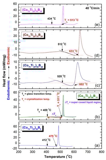 Differential scanning calorimetry (DSC) thermograms of (a), (Co75Ti25)95B5 (b) (Co75Ti25)90B10, (c) (Co75Ti25)80B20, (d) (Co75Ti25)75B25, and (e) (Co75Ti25)70B30 powders obtained after 50 of MA time. The corresponding differential thermal analysis (DTA) curves for these systems are presented in Figure 10.