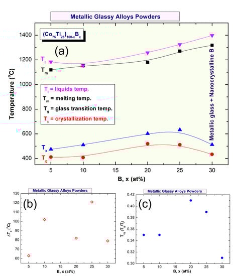 - Among the as-prepared metallic glassy alloys of (Co75Ti25)100−xBx, (Co75Ti25)75B25 system revealed excellent thermodynamics properties, as indexed by its high GFA as characterized by the widest ∆Tx (121 °C), and high thermal stability, indicated by its highest Tx value (633 °C). Moreover, this glassy system revealed the highest Trg value (0.41), which indicates its high GFA when compared with other compositions in the (Co75Ti25)100−xBx systems.
