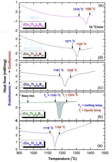 In parallel to ∆Tx parameter, the GFA of any metallic glassy alloys produced by rapid solidification technique is described by measuring the melting (Tm) and liquids (Tl) temperature, and calculate the Trg = Tg/Tl. All the DTA curves of (Co75Ti25)100−xBx systems presented in Figure 10a–e display a single endothermic event for each composition. This endothermic peak revealed an obvious head and tail points, which related to Tm and Tl temperature, respectively (Figure 10). The onset temperature of Tm and Tl values measured for the (Co75Ti25)95B5 system were 1119 °C and 1184 °C (Figure 9a or Figure 10a), respectively, where the corresponding Trg of this composition was calculated and found to be 0.35 (Figure 9c). However, increasing the B concentration to 10 at% (Figure 10b) led to a significant increase in both Tm (1153 °C) and Tl (1224 °C), but corresponding Trg of this composition has not been improved and remained at the level of (0.35), as presented in Figure 9c. Both of Tm and Tl tended to increase with increasing the B content to be 1181 °C and 1268 °C ((Co75Ti25)80B20), and 1271 °C and 1324 °C ((Co75Ti25)75B25), as presented in Figure 10c,d, respectively. Notably, no improvement in Trg value could be detected, as shown in Figure 9c. The DTA trace of (Co75Ti25)70B30 system, which consisted of a glassy phase coexisted with nano-spheres of unprocessed crystalline B particles showed the highest value of Tm (1319 °C) and Tl (1398 °C), as indexed in Figure 10e. However, this system revealed the lowest value of Trg (0.31), as presented in Figure 9c.