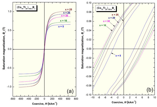 (a) Hysteresis B-H loops of (Co75Ti25)100−xBx metallic glassy systems. The Hysteresis was presented with a different scale in (b).