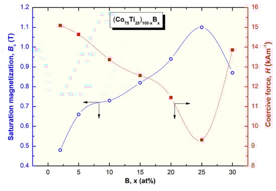 Effect of B content (x, at%) on the saturation magnetization and coercive force of (Co75Ti25)100−xBx metallic glassy systems.